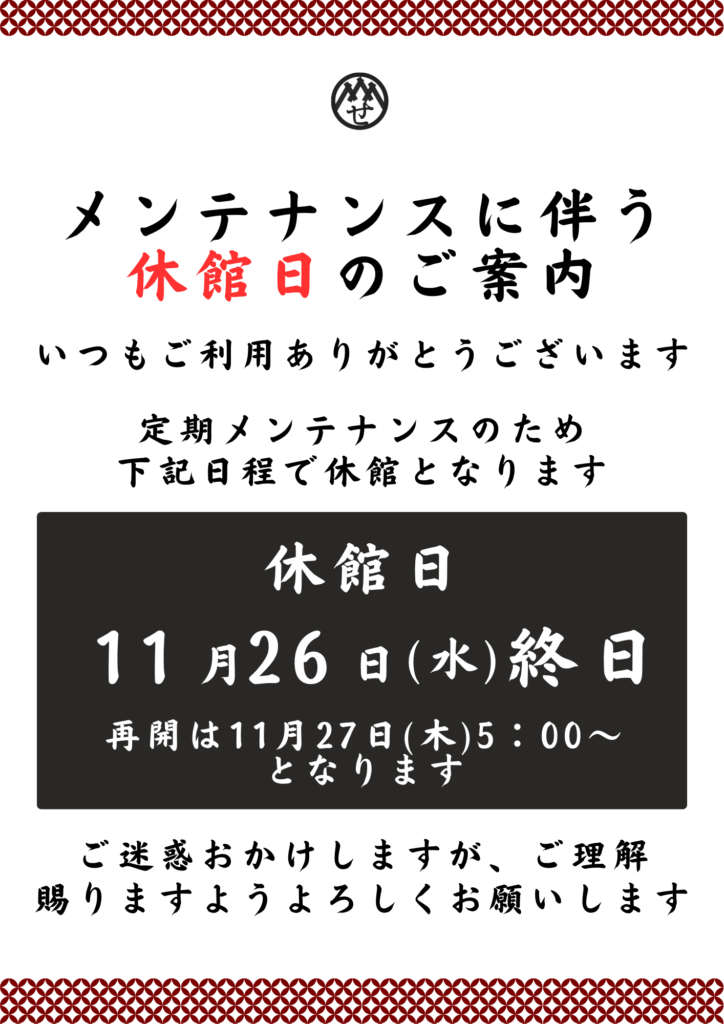【休館日のお知らせ】メンテナンスに伴う11月の休館日について